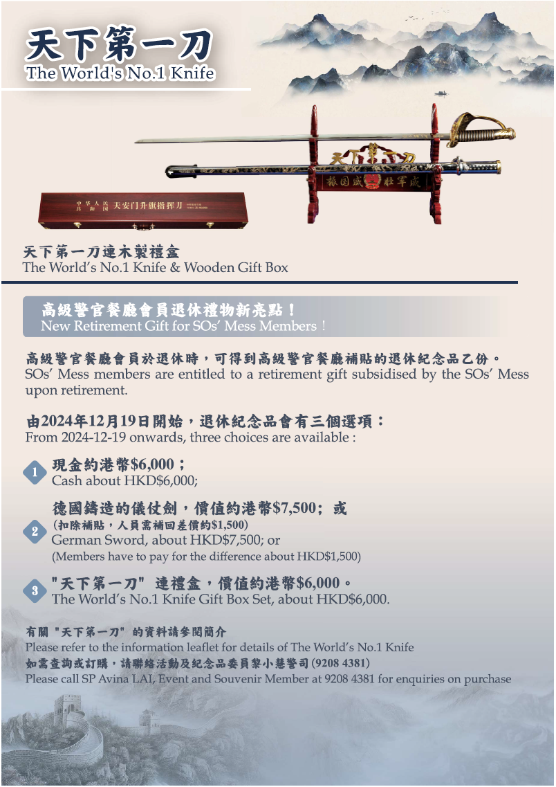 For any enquiry, please contact the SOs' Mess manager at e-mail: so-mess-manager@police.gov.hk or 2860 2348.